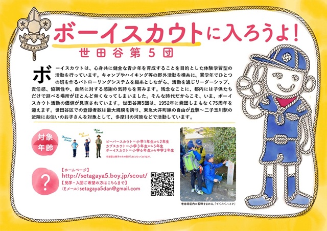 ボーイスカウト世田谷第5団は,個人情報の取り扱いに関する法令等を遵守するとともに,本サイトをご利用になった皆さまのお名前・メールアドレス等の個人情報について,その適切な取り扱い及び保護に努めます。また,当団は今後とも,個人情報の取り扱いに関する法令や社会環境の変化等に応じて,本サイトにおける個人情報保護ポリシーを適宜見直し,改善を図ってまいります。従って,本ポリシーは予告なしに変更される場合がある事をご了承下さい。なお,その際には,本サイト上に掲載することによりご利用の皆さまに公開します。